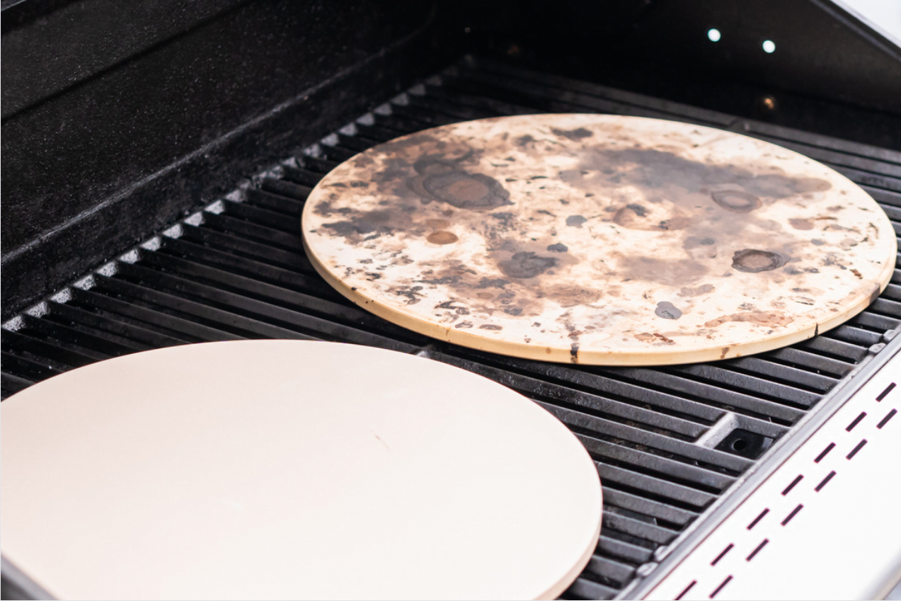 Because the pizza stone is very porous, moisture from the pizzas is absorbed into the pizza stone during baking. The moisture that soaks into the pizza stone evaporates later, but the color of the residue of dough and cheese that is drawn into the stone with the moisture remains behind in the stone and becomes black. This residue is difficult to remove from the stone and it is normal for the stone to discolour. This does not affect the baking properties of the pizza stone. It is best to remove the superficial dirt before baking, as it can give a burnt taste to the pizzas you bake. NEVER place the pizza stone in a dishwasher and do not immerse it under water or a jet of water.